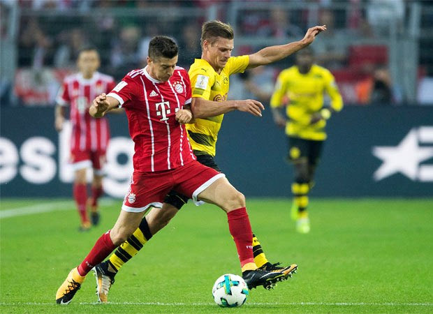 Λεβαντόφσκι και Πίστσεκ μονομαχούν στον πρόσφατο τελικό του γερμανικού Σούπερ Καπ, τον οποίον κατέκτησε τελικά η Μπάγερν στα πέναλτι (Marius Becker/dpa via AP)