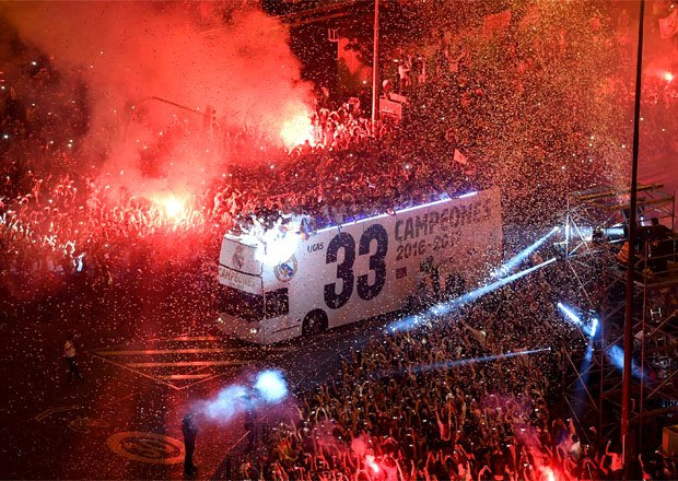 Οι παίκτες της Ρεάλ Μαδρίτης φτάνουν στην Plaza de Cibeles για να πανηγυρίσουν μαζί με τους φιλάθλους τους την κατάκτηση του πρωταθλήματος της σεζόν 2016/17