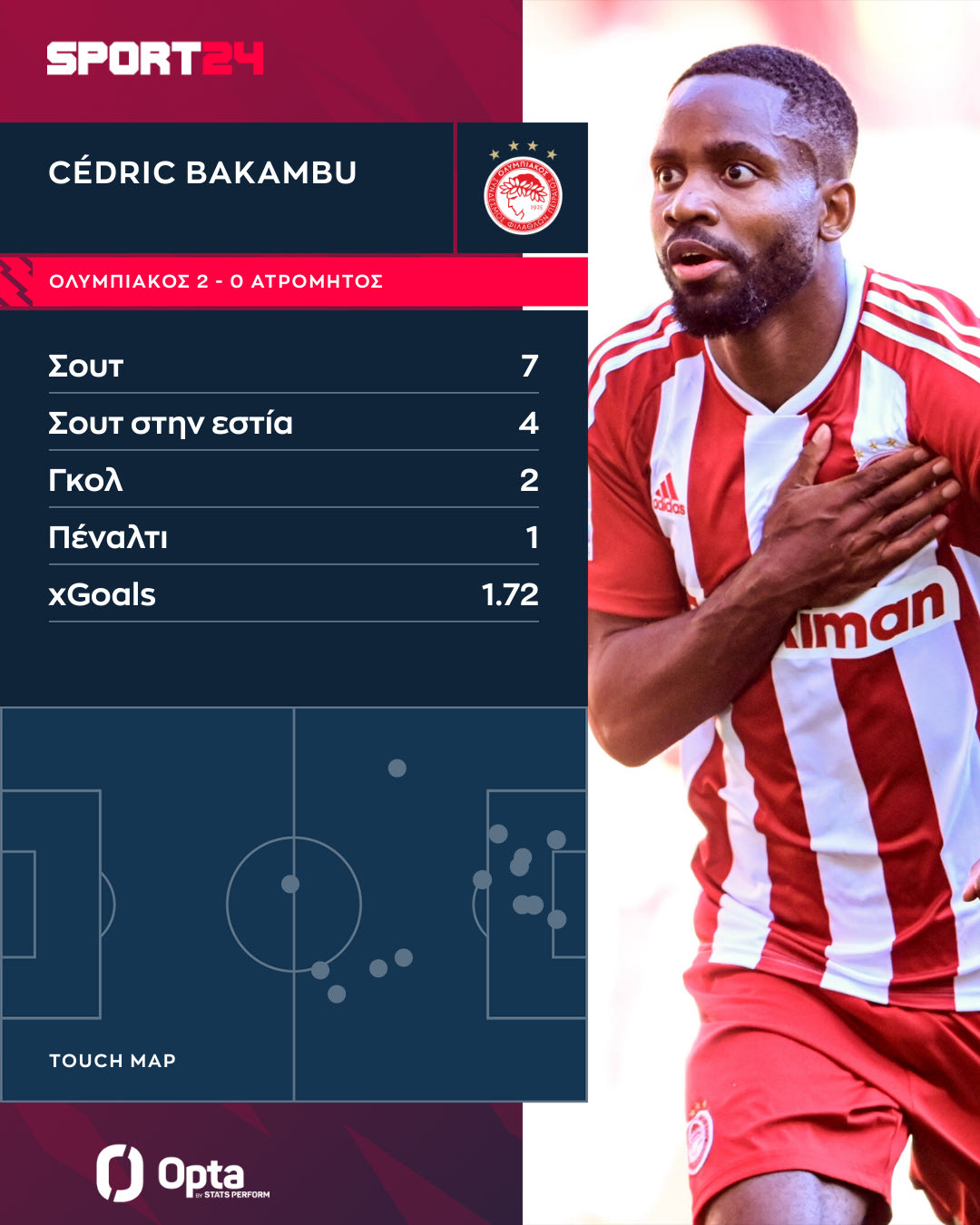 Ο Μπακαμπού ήταν εκείνος που έψαχναν συνεχώς οι παίκτες του Ολυμπιακού, με τον ίδιο να κινείται ανάμεσα στις γραμμές του Ατρομήτου και να ψάχνει χώρο, ώστε να φύγει στην πλάτη της άμυνας. Το έκανε στο πέναλτι που κέρδισε, αλλά και στο 2-0, μετά τη μεταβίβαση του Βαλμπουενά.
