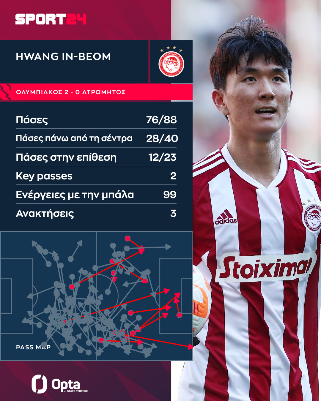 Γι’ ακόμη ένα παιχνίδι είχε υψηλό αριθμό ενεργειών, συγκεκριμένα 99 και ήταν ο πιο ενεργός ποδοσφαιριστής στο παιχνίδι του Ολυμπιακού. Φαίνεται πως ο Ίνμπομ Χουάνγκ έχει “κλειδώσει” ως 8άρι ως παρτενέρ του Εμβιλά και είναι από τα πιο σημαντικά “γρανάζια” των ερυθρόλευκων.