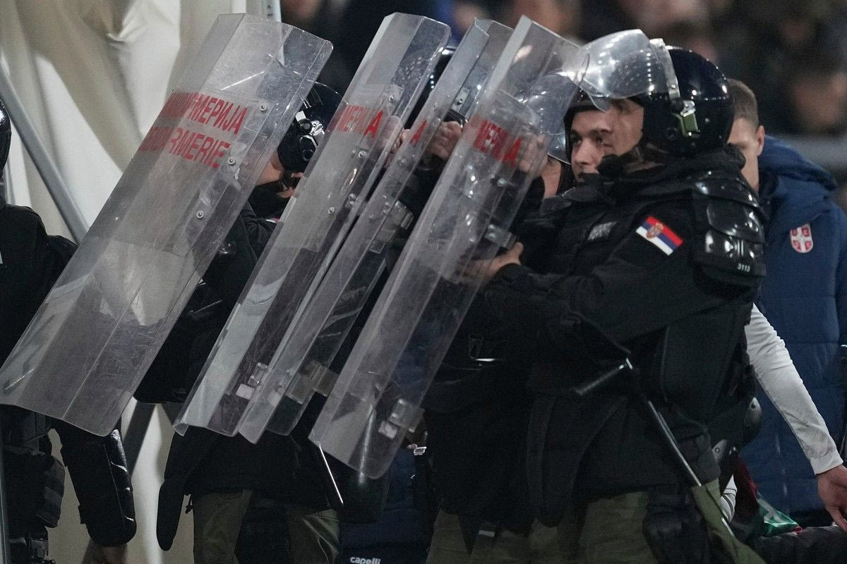 Με το που έληξε το ημίχρονο, άμεσα παρατάχθηκαν αστυνομικές δυνάμεις στη φυσούνα για να μπουν στα αποδυτήρια οι παίκτες της Αλβανίας χωρίς παρατράγουδα. Το κλίμα βέβαια μυρίζει μπαρούτι, με τους Σέρβους από τις εξέδρες να τραγουδούν συνθήματα με πολιτικό περιεχόμενο.