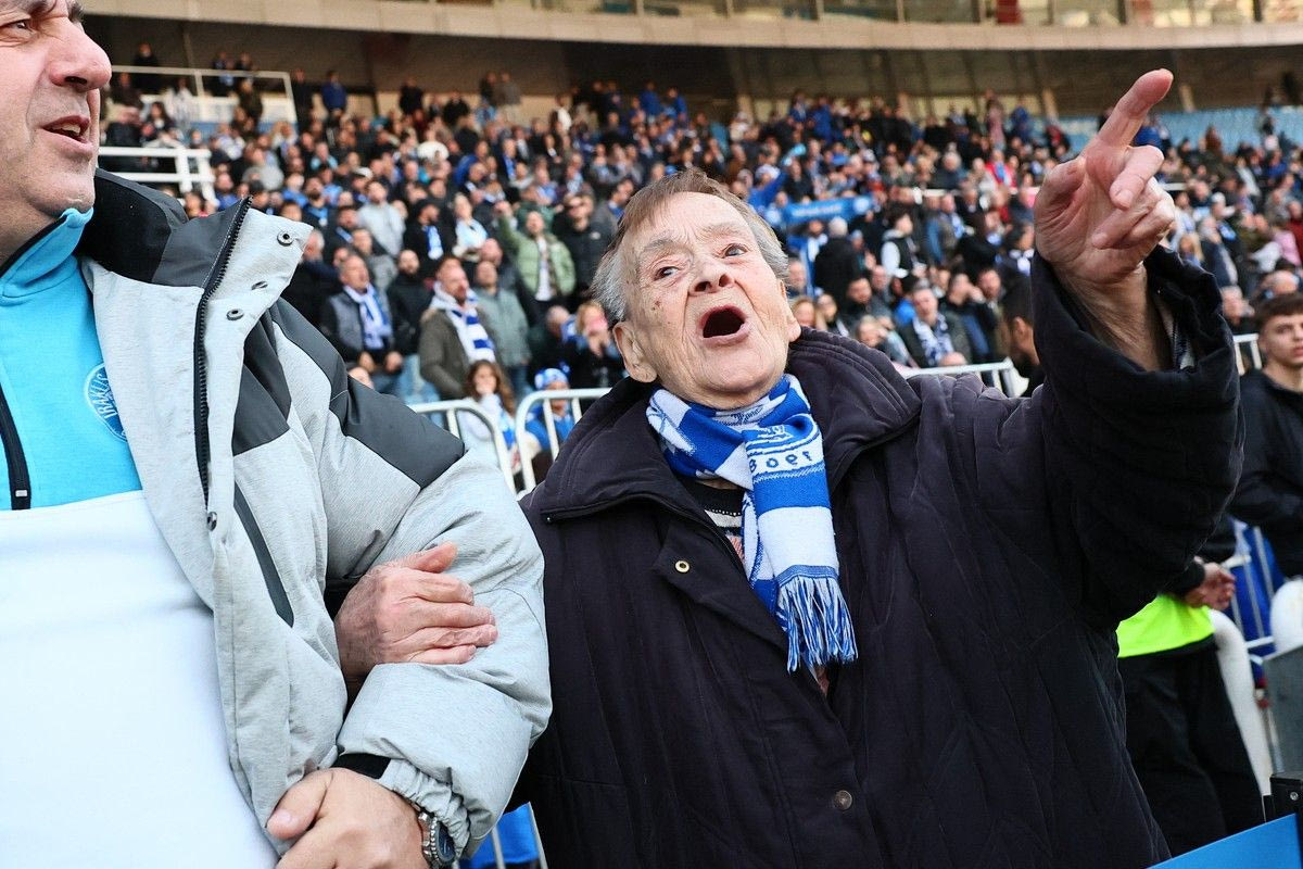 Η εμβληματική οπαδός του Ηρακλή, κυρία Χάιδω, βρέθηκε το απόγευμα της Κυριακής (22/3) φορώντας το κασκόλ της στο Καυτανζόγλειο κι έδωσε ξεχωριστό χρώμα από τις εξέδρες.