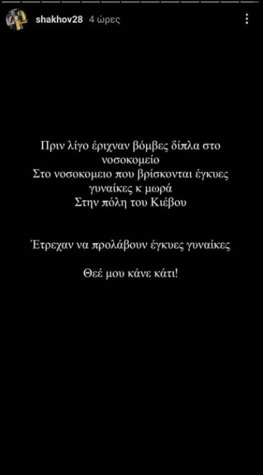 “Πριν λίγο έριχναν βόμβες δίπλα στο νοσοκομείο. Στο νοσοκομείο που βρίσκονται έγκυες γυναίκες και μωρά. Στην πόλη του Κιέβου. Έτρεχαν να προλάβουν έγκυες γυναίκες. Θεέ μου κάνε κάτι”, έγραψε στο story του ο παίκτης της ΑΕΚ.