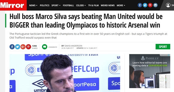 Ο Μάρκο Σίλβα παραχώρησε συνέντευξη Τύπου ενόψει του αγώνα της Χαλ με τη Γιουνάιτεντ για το League Cup Αγγλίας και υποστήριξε πως μία νίκη επί των "Κόκκινων Διαβόλων" θα είναι διαφορετική απ' την αντίστοιχη του Ολυμπιακού επί της Άρσεναλ.