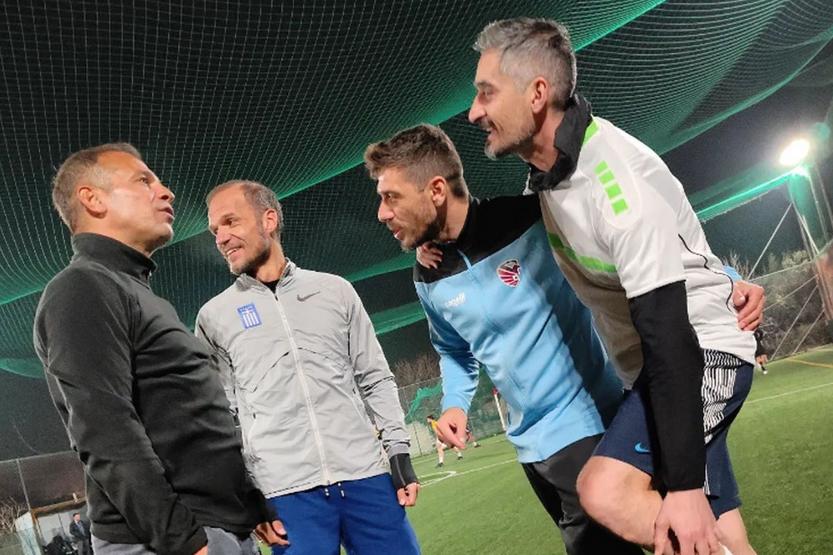 Τρεις πρώην πρωταθλητές Ευρώπης με την Εθνική, ο Ντέμης Νικολαΐδης, ο Άγγελος Μπασινάς, ο Κώστας Κατσουράνης και ο Νίκος Λυμπερόπουλος που τίμησε τη φανέλα με το εθνόσημο, συναντήθηκαν στον αγωνιστικό χώρο και έπαιξαν ποδόσφαιρο σε 8X8.