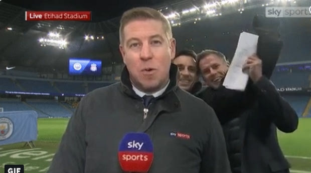 Το Sky Sports "ανέβασε" gif με τους Νέβιλ - Κάραγκερ την ώρα που ο ρεπόρτερ μετέδιδε τα νέα των Σίτι - Λίβερπουλ κι εκείνοι έκαναν πλάκα από πίσω του (PHOTO).