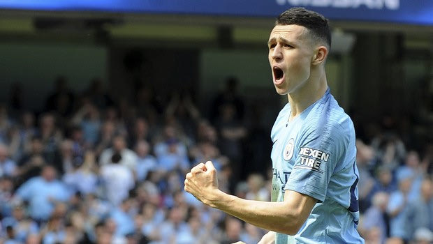 Manchester City's Phill Foden celebrates his goal against Tottenham during the English Premier League soccer match between Manchester City and Tottenham Hotspur at Etihad stadium in Manchester, England, Saturday, April 20, 2019. (AP Photo/Rui Vieira)