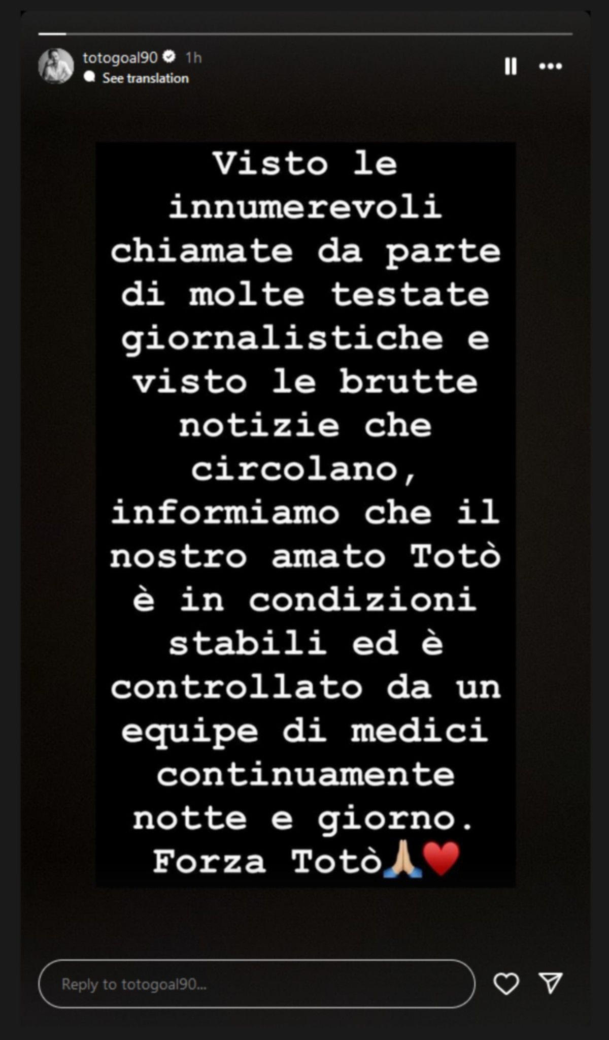 Δεδομένων των αμέτρητων κλήσεων από πολλές εφημερίδες και δεδομένων των κακών ειδήσεων που κυκλοφορούν, σας ενημερώνουμε ότι ο αγαπημένος μας Τοτό είναι σε σταθερή κατάσταση και παρακολουθείται από ομάδα γιατρών συνεχώς, νύχτα και μέρα. Δύναμη Τοτό”, ανέφερε χαρακτηριστικά το μήνυμα της οικογένειας.