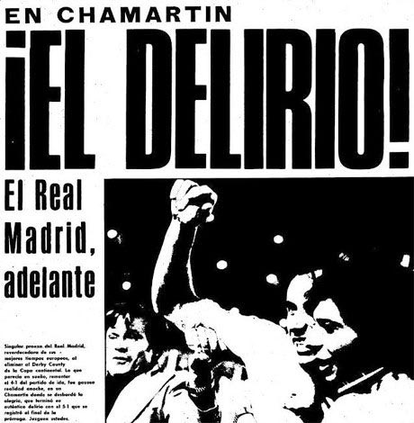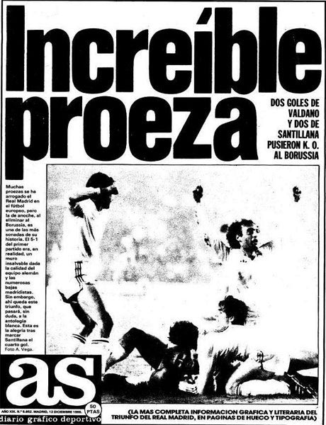 Ήταν ο Σαντιγιάνα αυτός που πέτυχε το τελικό 5-1 που έδωσε τη μεγάλη πρόκριση στους «μερένγκες», προκαλώντας γενικό ντελίριο μέσα στο «Μπερναμπέου», όπως τιτλοφορεί στο πρωτοσέλιδό της και η «As». Στη συνέχεια της διοργάνωσης, η Ρεάλ απέκλεισε στα προημιτελικά την Γκλάντμπαχ για να αποκλειστεί στον ημιτελικό με τη σειρά της από τον κακό της δαίμονα στην Ευρώπη, την Μπάγερν Μονάχου (η οποία στον τελικό κέρδισε 1-0 την Σεντ Ετιέν και πήρε τον τρίτο συνεχόμενο τίτλο της).