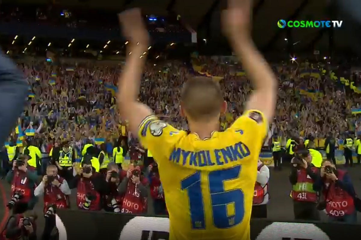 Οι παίκτες της Ουκρανίας μετά τον θρίαμβο επί της Σκωτίας πανηγύρισαν έξαλλα την πρόκριση στον τελικό των μπαράζ μαζί με τον κόσμο τους που βρέθηκε στο Χάμπντεν Παρκ.
