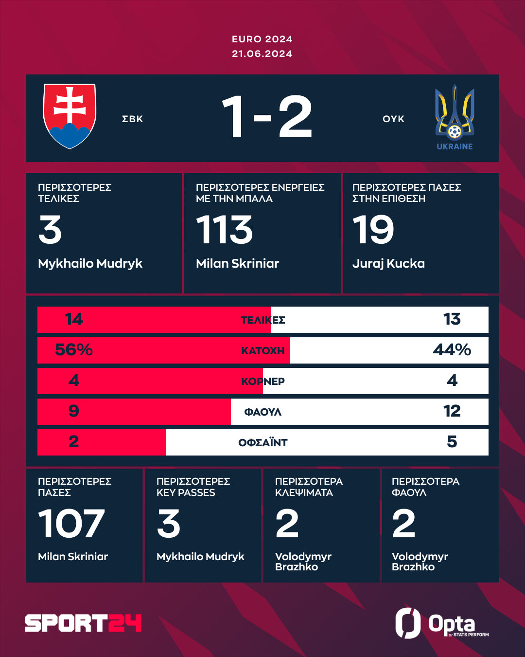 Στα εναπομείναντα λεπτά μέχρι το τελικό σφύριγμα, η Σλοβακία επιχείρησε να βγει μπροστά και να ασκήσει πίεση για να πάρει έστω τον έναν βαθμό, όμως οι Ουκρανοί είχαν πλέον υπέρ τους το μομέντουμ, με τους παίκτες του Σεργκέι Ρεμπρόφ να… καταπίνουν σίδερα και να υπερασπίζονται με απόλυτη επιτυχία το τρίποντο που τους κρατάει μέσα στο κόλπο της πρόκρισης.