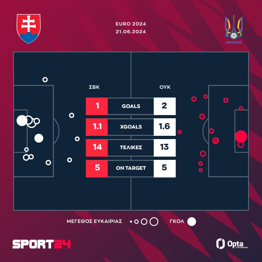 Ως συνέπεια, η επόμενη μεγάλη φάση καταγράφηκε στο 74′ σε ταχύτατη αντεπίθεση των Ουκρανών, με τον Μούντρικ να κάνει το σουτ από πλάγια θέση και τον κίπερ των Σλοβάκων να αποκρούει έχοντας ως σύμμαχο και το δεξί δοκάρι της εστίας του.