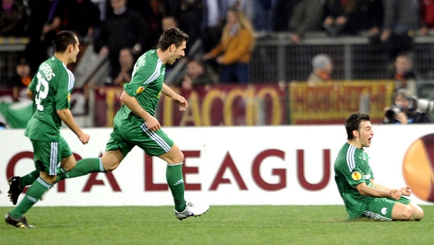 Ο Σωτήρης Νίνης πανηγυρίζει το γκολ κόντρα στη Ρόμα