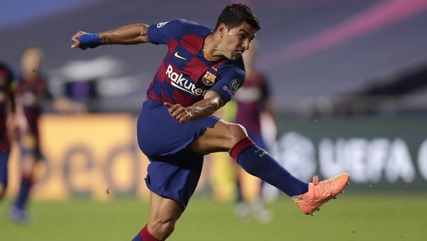 Barcelona's Luis Suarez after kicking the ball during the Champions League quarterfinal match between FC Barcelona and Bayern Munich at the Luz stadium in Lisbon, Portugal, Friday, Aug. 14, 2020. (AP Photo/Manu Fernandez/Pool) AP