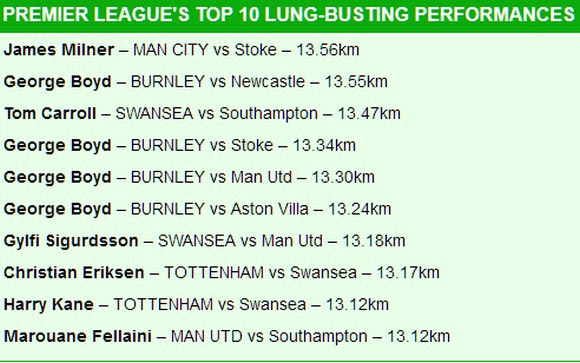 ‘Ενα ακόμα μεγάλο όνομα της Πρέμιερ Λιγκ ο Μαρουάν Φελαϊνί της Μάντσεστερ Γ. στον αγώνα με την Σάουθάμπτον τον περασμένο Δεκέμβη έκανε 13.13 χιλιόμετρα. Τέλος, δύο παίκτες της Σουόνσι βρίσκονται στην λίστα με τα περισσότερα χιλιόμετρα σε ένα ματς. Ο Σίγκουρτσον με 13.18 χιλιόμετρα στο ματς με την Μάντσεστερ και ο Τομ Κάρολ με 13.47 στο ματς με την Σάουθάμπτον.