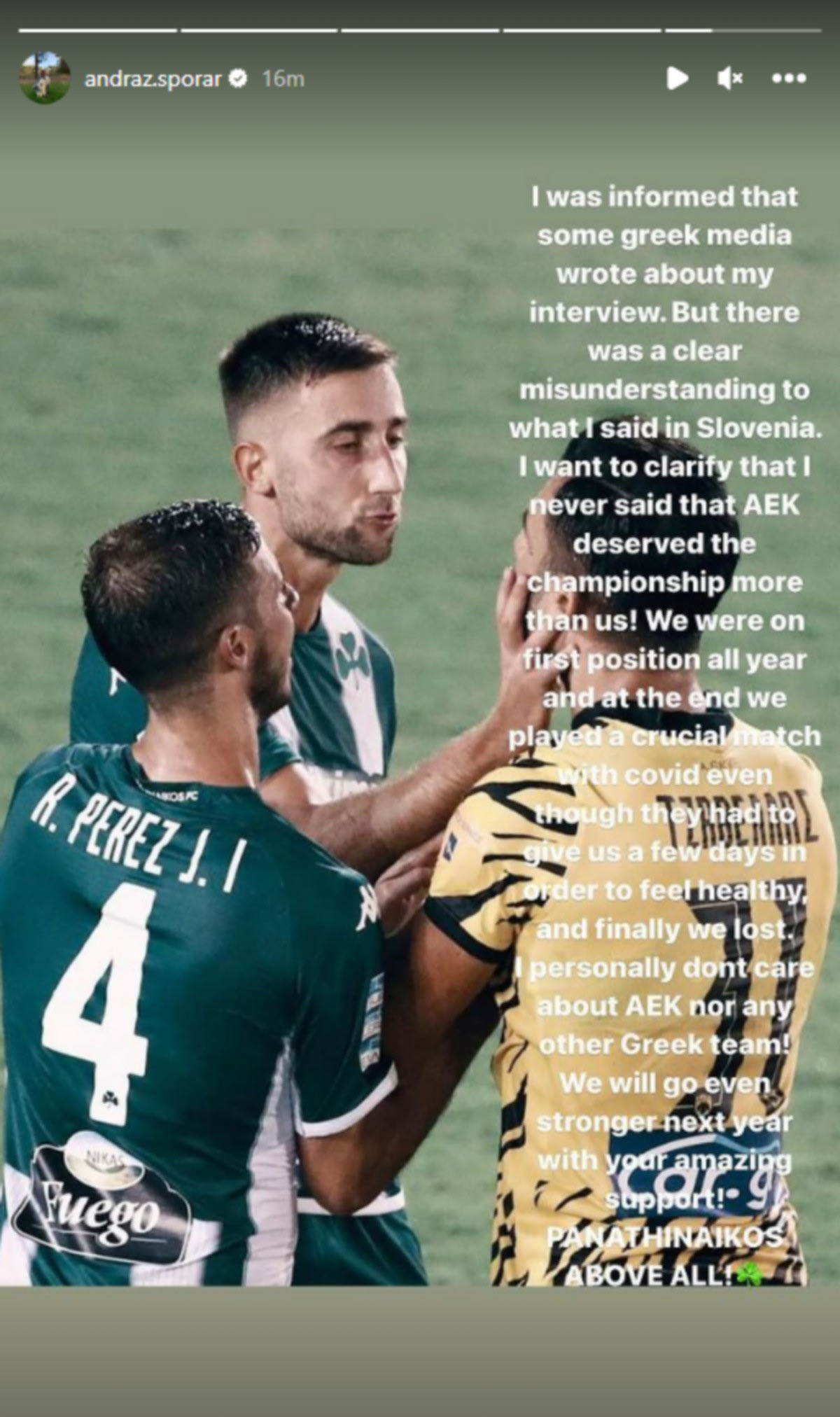 Ο Αντράζ Σπόραρ με ποστάρισμα του στο instagram πήρε θέση για μια ατάκα και τον τρόπο που αυτή του αποδώθηκε από τη συνέντευξη του στη Σλοβενία. Ο σέντερ φορ του “τριφυλλιού” σημείωσε πως ποτέ δεν είπε ότι η ΑΕΚ άξιζε περισσότερο το πρωτάθλημα από τον Παναθηναϊκό.