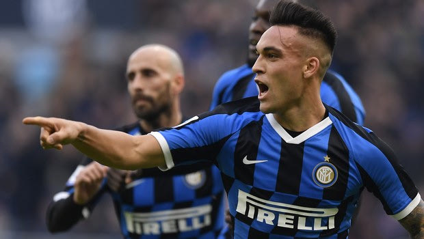 Inter Milan's Lautaro Martinez celebrates after scoring his side's opening goal during the Serie A soccer match between Inter Milan and Cagliari at the San Siro Stadium, in Milan, Italy, Sunday, Jan. 26, 2020. (Fabio Ferrari/Lapresse via AP) Fabio Ferrari/Lapresse via AP