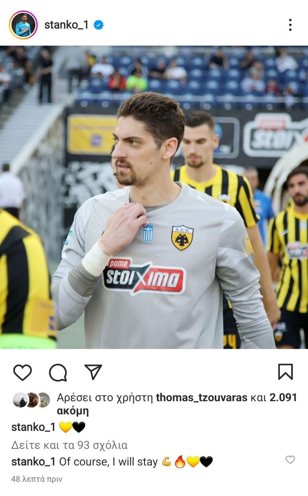 Ο Τσίτσαν Στάνκοβιτς σχολίασε μια ανάρτηση που έκανε ο ίδιος στον λογαριασμό του στο Instagram, δηλώνοντας ότι θα μείνει στην ΑΕΚ και τη νέα χρονιά.