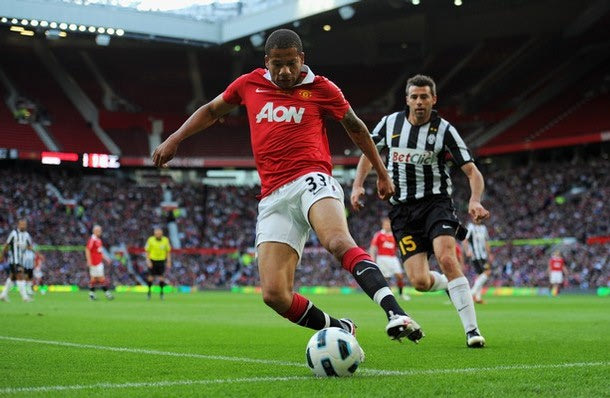 MANCHESTER, ENGLAND - MAY 24: Bebe of Manchester United controls the ball as Andrea Barzagli of Juve looks on during the Gary Neville Testimonial Match between Manchester United and Juventus at Old Trafford on May 24, 2011 in Manchester, England. (Photo by Michael Regan/Getty Images)