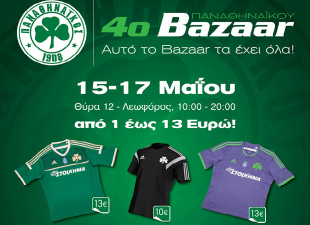 Το τέταρτο bazaar του Παναθηναϊκού θα διεξαχθεί στην Λεωφόρο από την Παρασκευή 15 Μαΐου έως την Κυριακή 17 Μαΐου και πλήθος κόσμου αναμένεται να δώσει το παρών αγοράζοντας προϊόντα του τριφυλλιού αξίας από 1 έως 13 ευρώ.