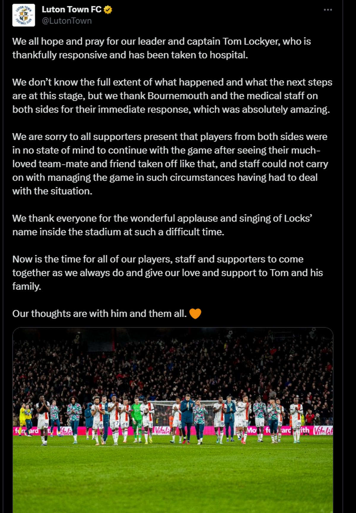 Η Λούτον εξέδωσε ανακοίνωση για την κατάσταση της υγείας του Τομ Λόκιερ, μετά την κατάρρευση στον αγωνιστικό χώρο στο ματς με την Μπόρνμουθ, ενημερώνοντας ότι έχει διακομισθεί στο νοσοκομείο και πως ανταποκρίνεται με το περιβάλλον κι έχει τις αισθήσεις του.