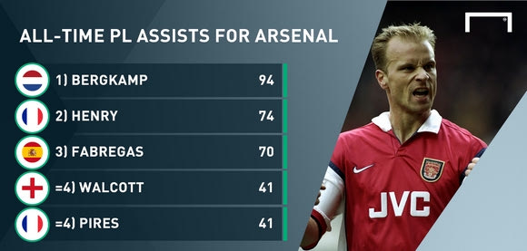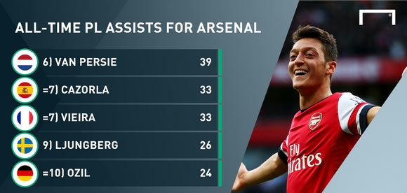 Μετράει ήδη 24 και απέχει 70 ασίστ (!) από τον βασιλιά της σχετικής κατηγορίας, Ντένις Μπέργκαμπ (94) ενώ πέρα από τον Εζίλ στη δεκάδα υπάρχουν δύο ακόμα νυν μέλη της ομάδας: ο Θίο Γουόλκοτ (στην 4η θέση με 41 ασίστ) και ο Σάντι Καθόρλα (στην 7η με 33 ασίστ).