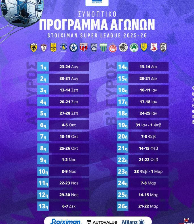 Λίγες ώρες πριν από την κλήρωση του νέου ποδοσφαιρικού πρωταθλήματος (9/7, 21:00, LIVE από το SPORT24) μέσω της οποίας θα αρχίσει η αντίστροφη μέτρηση για την έναρξη της σεζόν 2025-26, η Super League έδωσε στη δημοσιότητα το ετήσιο συνοπτικό πρόγραμμα αγώνων της κανονικής περιόδου.