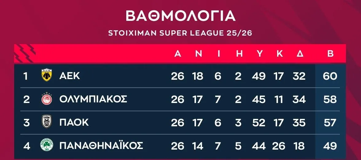 Η κανονική διάρκεια της Stoiximan Super League ολοκληρώθηκε χθες Κυριακή (22/3) με την τελευταία αγωνιστική. Εκεί, η ΑΕΚ νίκησε 3-0 την Κηφισιά και σε συνδυασμό με την ισοπαλία του Ολυμπιακού κόντρα στην ΑΕΛ με 0-0 και την ήττα του ΠΑΟΚ στον Βόλο με 2-1 τερμάτισε μόνη πρώτη στην κορυφή.