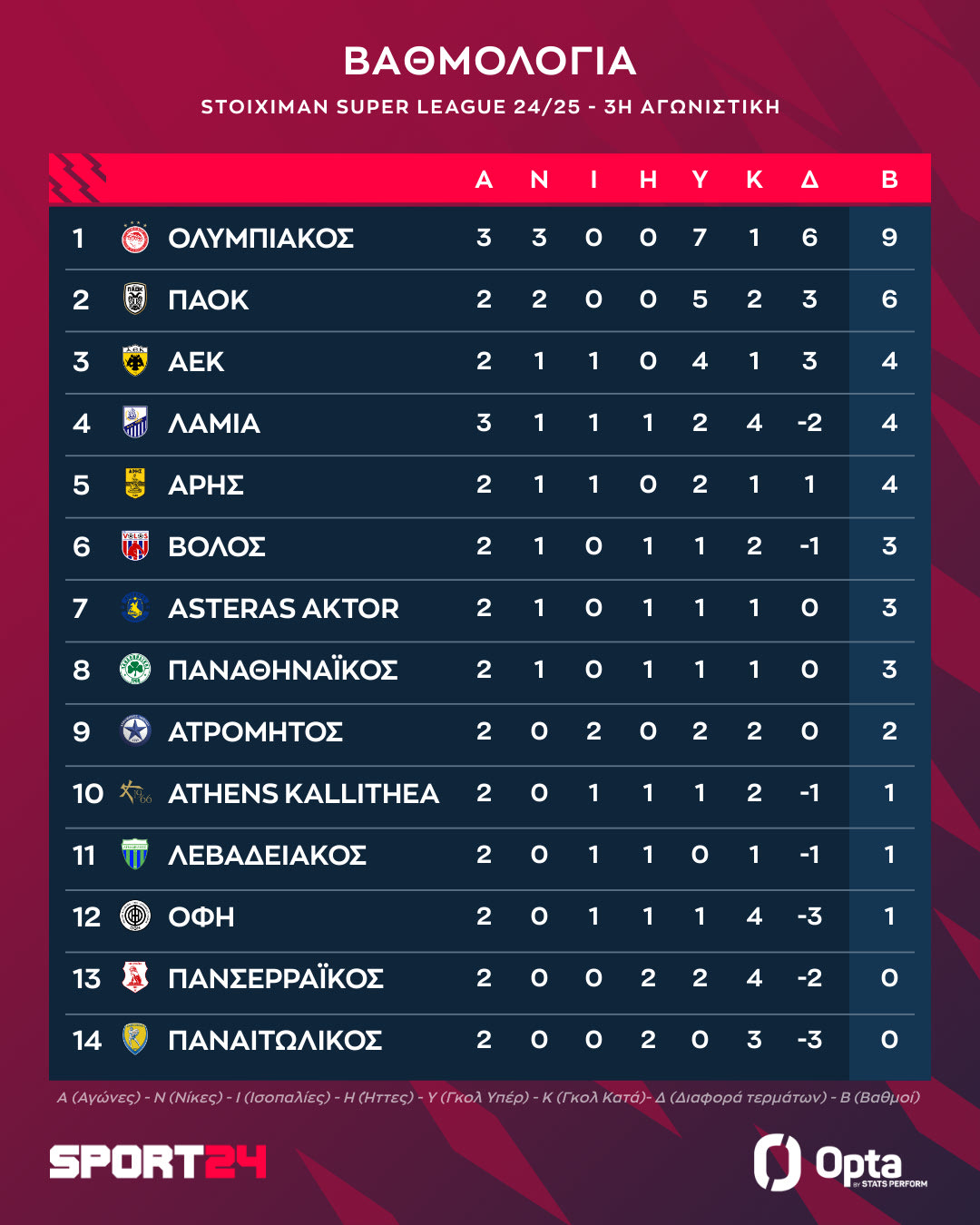 Έτσι, οι Πειραιώτες έκαναν το 3/3 στη Stoiximan Super League και διατηρήθηκαν στην κορυφή της βαθμολογίας με 9 βαθμούς, εν αναμονή πάντα των υπόλοιπων αναμετρήσεων της τρίτης αγωνιστικής.