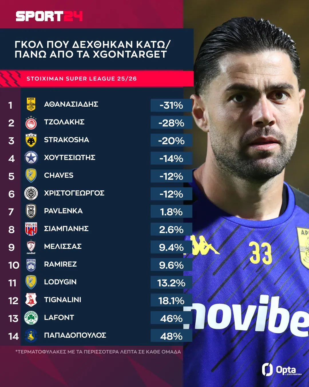 Ο Αθανασιάδης πρώτος στη λίστα. Ο τερματοφύλακας του Άρη δέχθηκε στην εστία του τελικές με τις οποίες ένας μέσος τερματοφύλακας θα έτρωγε 15.8 γκολ και εκείνος έφαγε 11, σχεδόν πέντε γκολ λιγότερα.