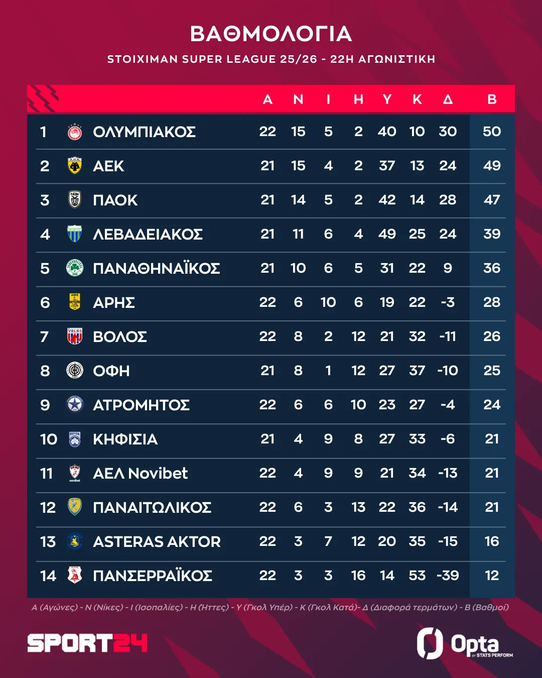 Το πρόγραμμα και τα αποτελέσματα της 22ης αγωνιστικής