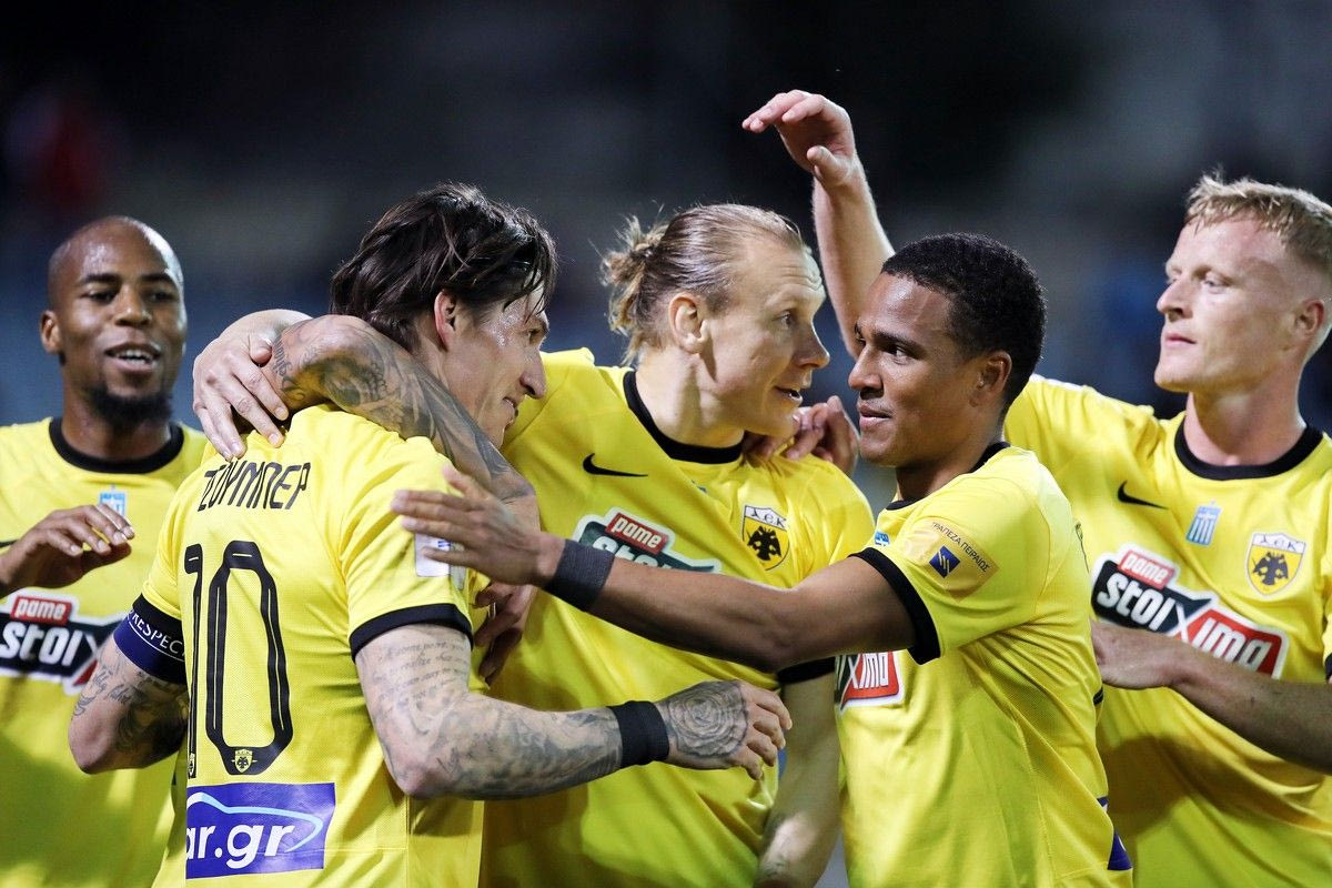 Οι παίκτες της ΑΕΚ πανηγυρίζουν κόντρα στη Λαμία