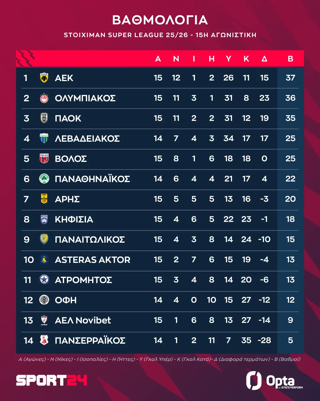 Δείτε πώς διαμορφώθηκε η βαθμολογία της Stoiximan Super League μετά τη νίκη της ΑΕΚ επί του ΟΦΗ για την 15η αγωνιστική.
