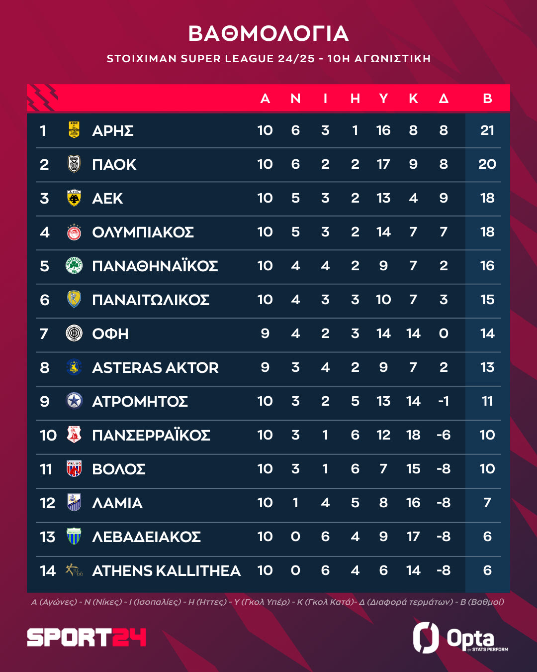 Stoiximan Super League: Η βαθμολογία μετά τη νίκη της ΑΕΚ στο Περιστέρι και την ανατροπή του ΠΑΟΚ επί της Λαμίας