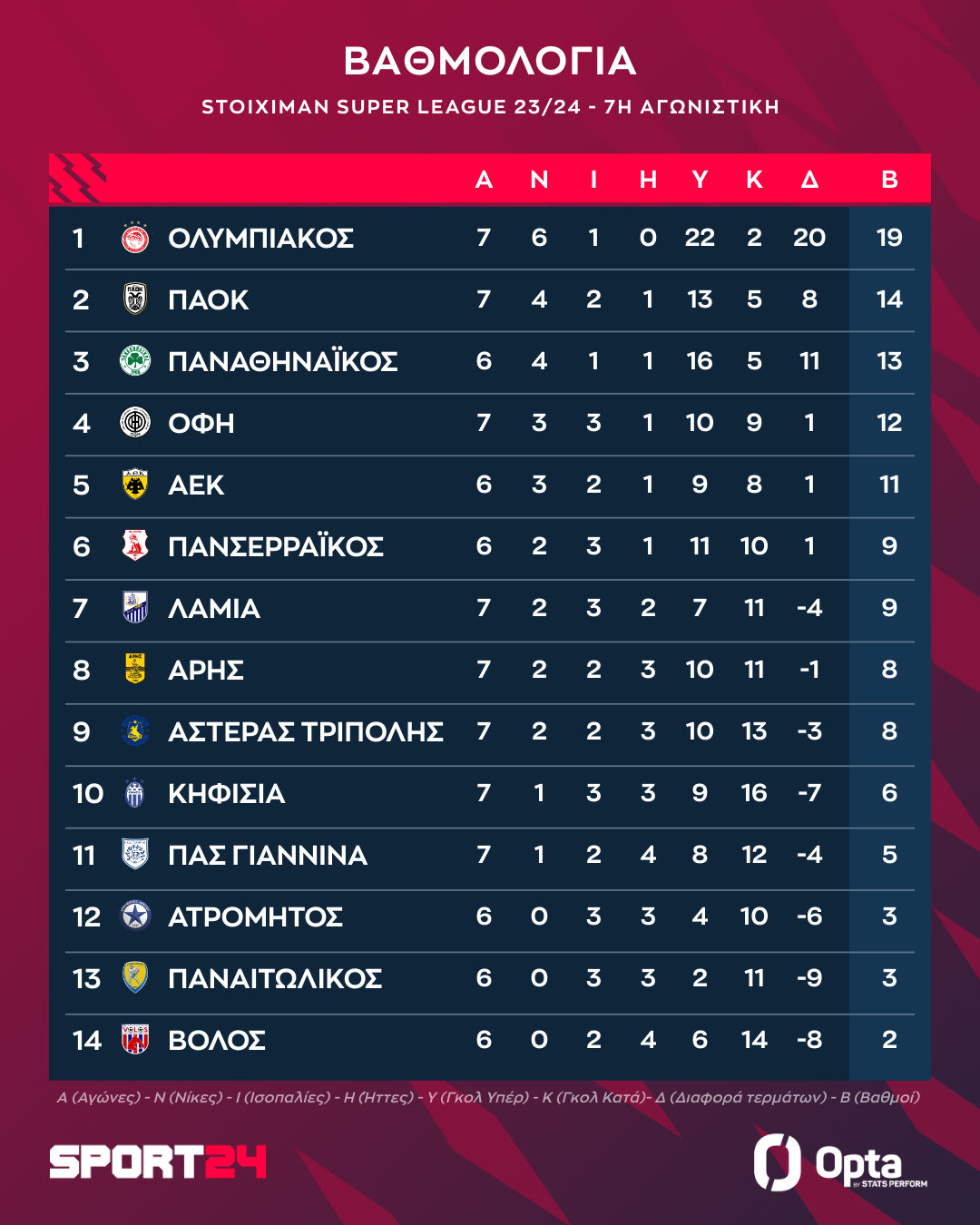 Stoiximan Super League: Η βαθμολογία μετά τη νίκη του ΟΦΗ επί της ΑΕΚ