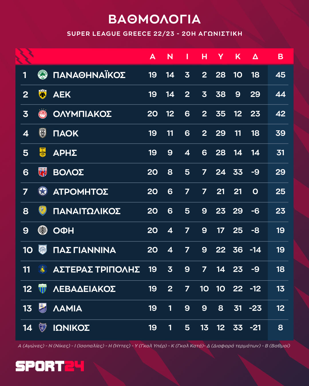 Το πρόγραμμα και τα αποτελέσματα της 20ης αγωνιστικής