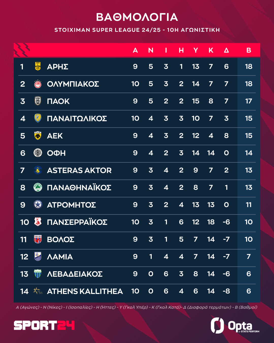 Δείτε πώς διαμορφώθηκε η βαθμολογία της Stoiximan Super League μετά τη νίκη του Ολυμπιακού επί του Πανσερραϊκού με 2-1 για τη 10η αγωνιστική.