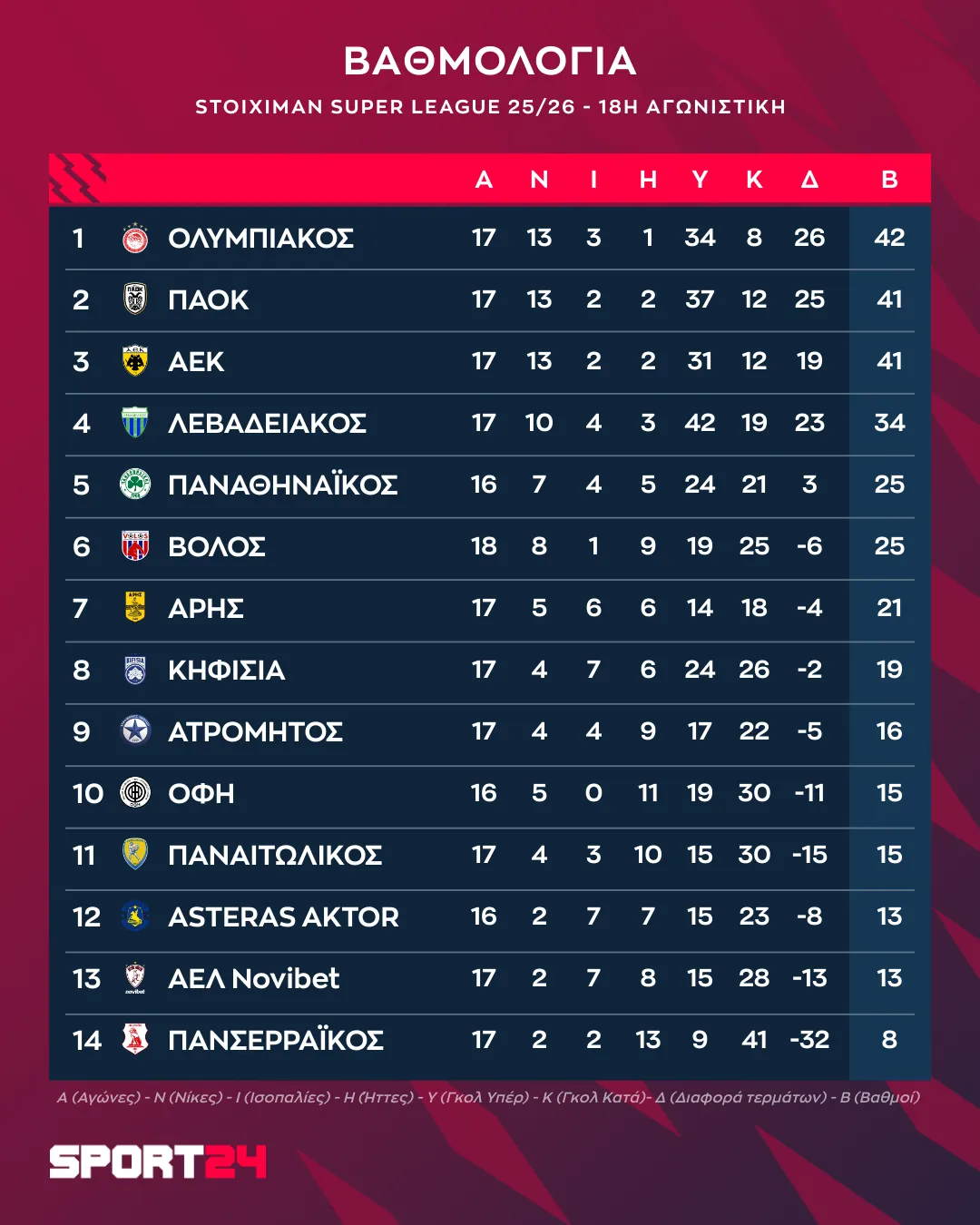 Δείτε πώς διαμορφώθηκε η βαθμολογία της Stoiximan Super League μετά τη νίκη του Ολυμπιακού επί του Βόλου στο Γεώργιος Καραϊσκάκης για τη 18η αγωνιστική.