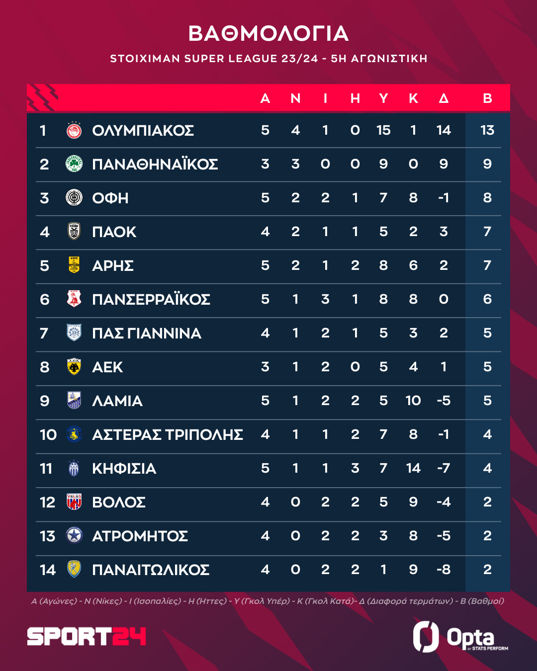 Stoiximan Super League: Η βαθμολογία μετά τη νίκη του Ολυμπιακού και του Άρη