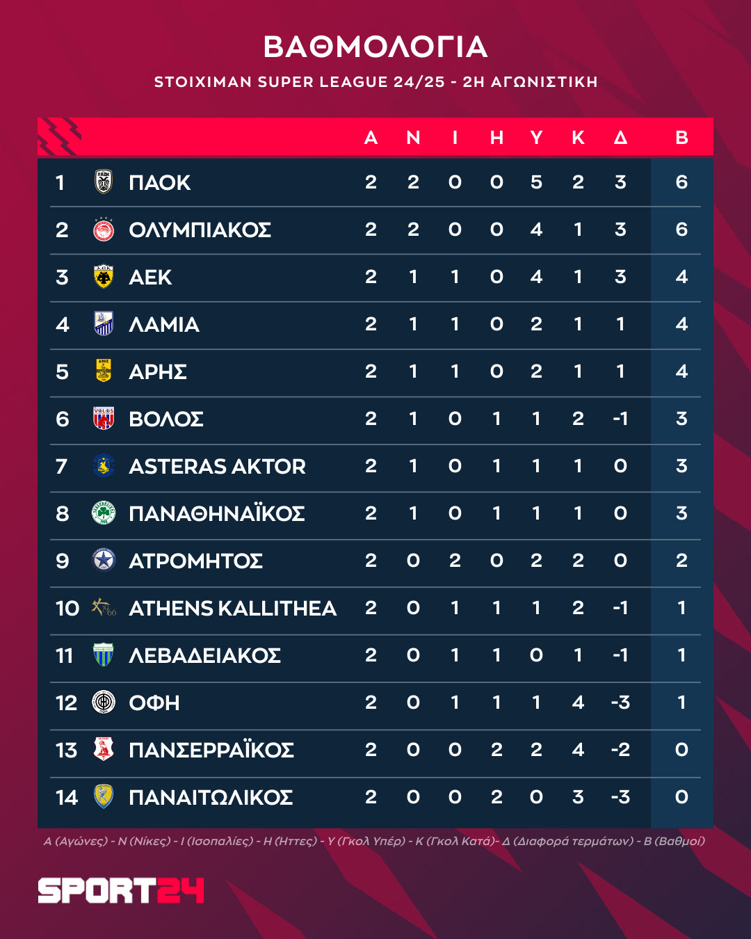 Δείτε πώς διαμορφώθηκε η βαθμολογία της Stoiximan Super League μετά τη νίκη του Ολυμπιακού κόντρα στην Athens Kallithea για τη 2η αγωνιστική.