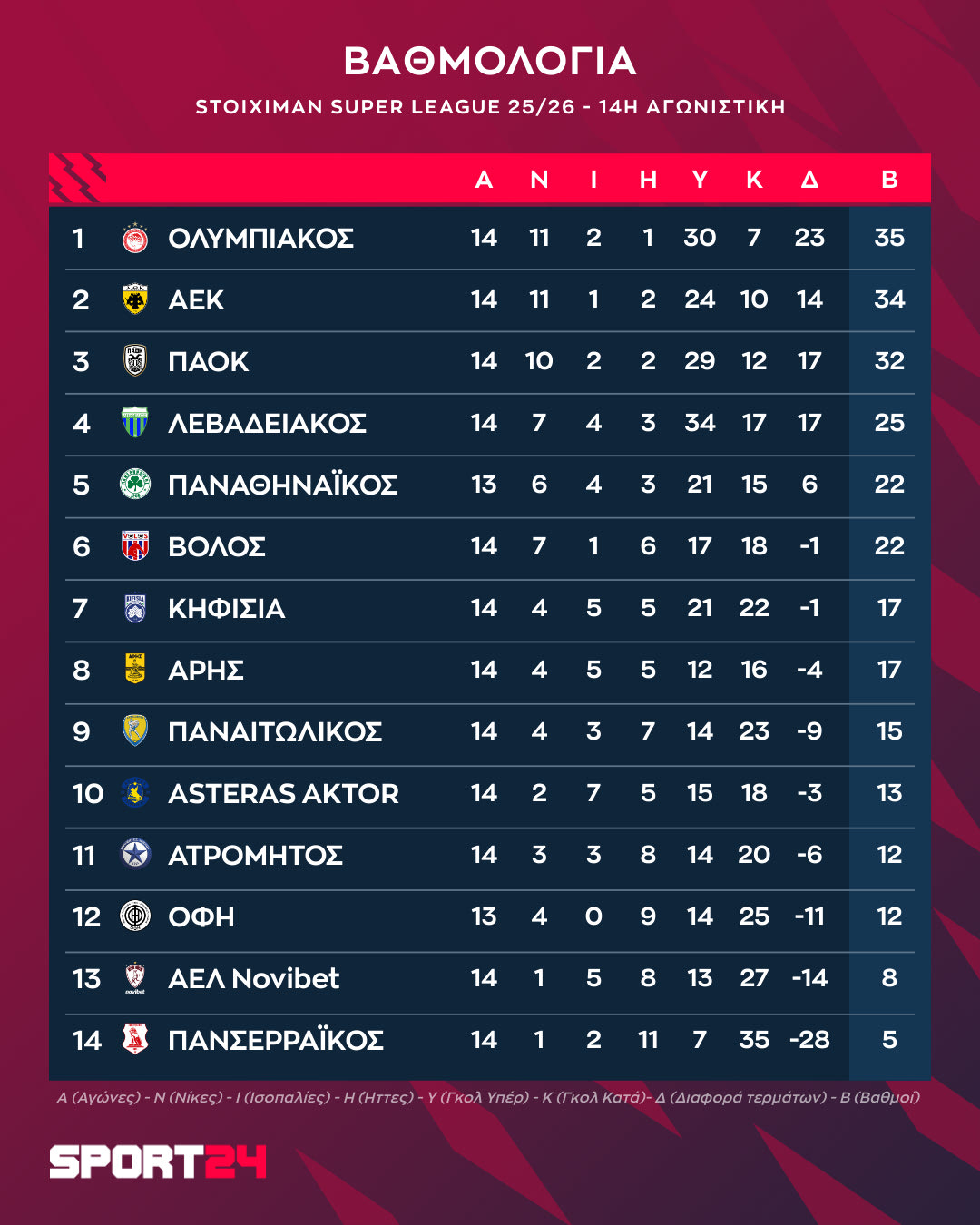 Έτσι, η ΑΕΚ μετά την “επέλασή” της στο Αγρίνιο και το 5-0 κόντρα στον Παναιτωλικό, είναι η μεγάλη νικήτρια της 14ης αγωνιστικής, αφού ανέβηκε στη 2η θέση, ούσα πλέον στο -1 από την κορυφή.