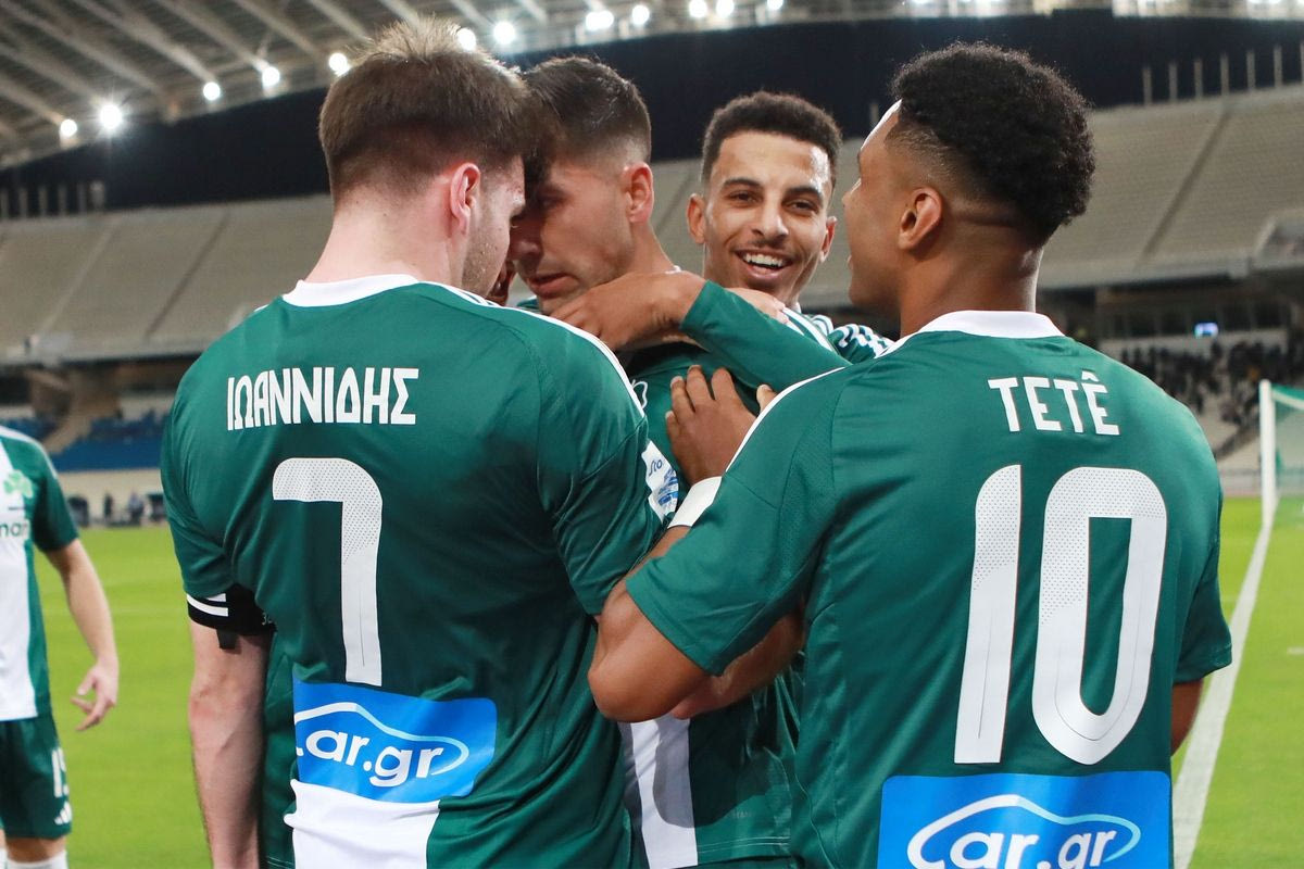 Οι παίκτες του Παναθηναϊκού πανηγυρίζουν το γκολ του Μπακασέτα κόντρα στη Λαμία