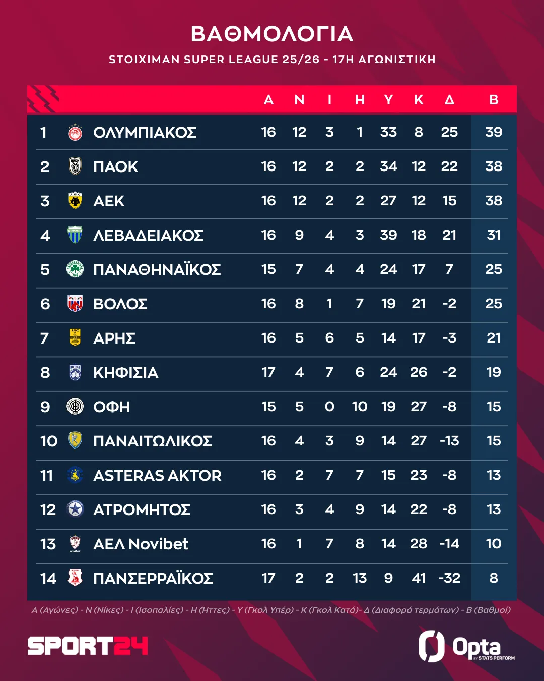 Δείτε πώς διαμορφώθηκε η βαθμολογία της Stoiximan Super League, μετά τη νίκη του Πανσερραϊκού επί της Κηφισιάς για την 17η αγωνιστική.