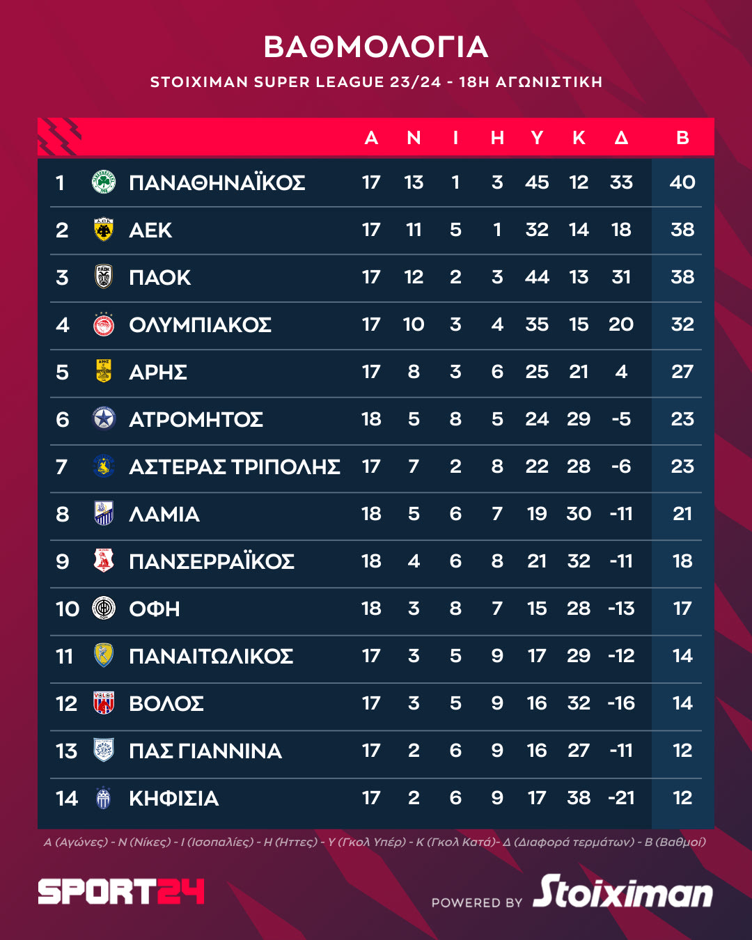 Τα αποτελέσματα της 18ης αγωνιστικής της Stoiximan Super League