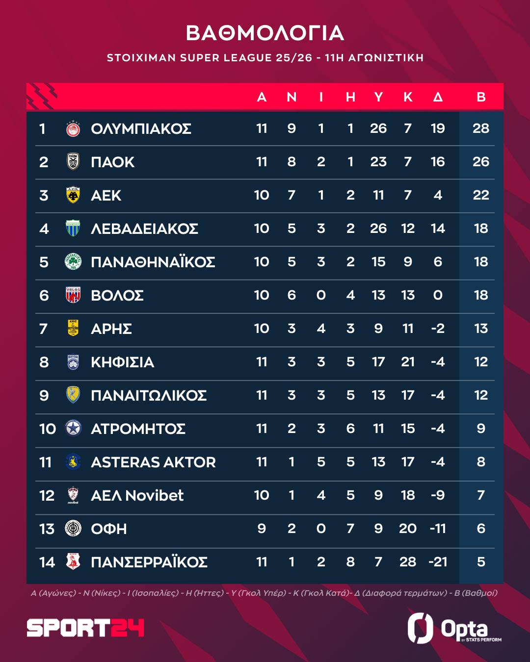 Δείτε πώς διαμορφώθηκε η βαθμολογία της Stoiximan Super League μετά τη νίκη του ΠΑΟΚ επί της Κηφισιάς για την 11η αγωνιστική.