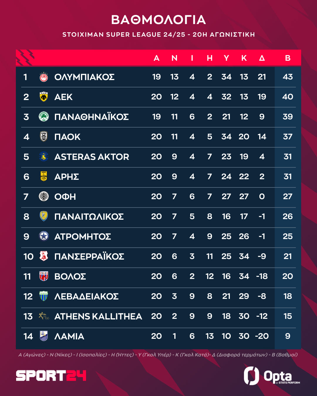 Το πρόγραμμα και τα αποτελέσματα της 20ης αγωνιστικής