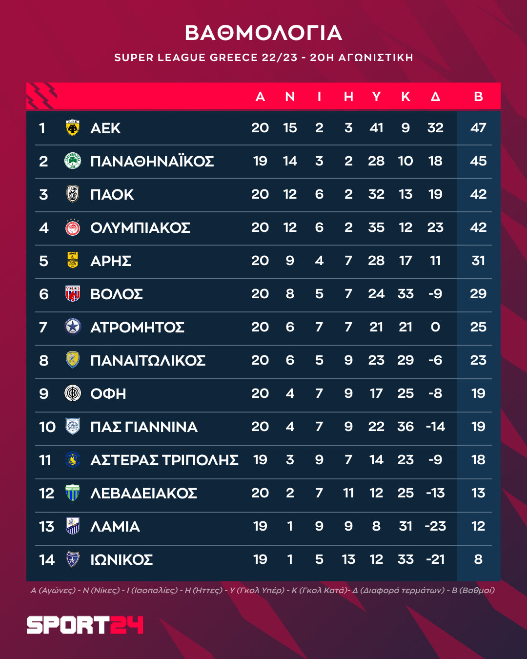 Το πρόγραμμα και τα αποτελέσματα της 20ης αγωνιστικής