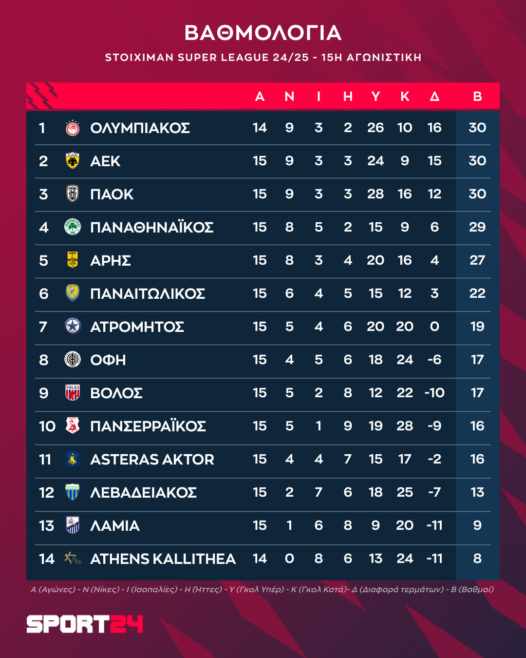 Το πρόγραμμα και τα αποτελέσματα της 15ης αγωνιστικής