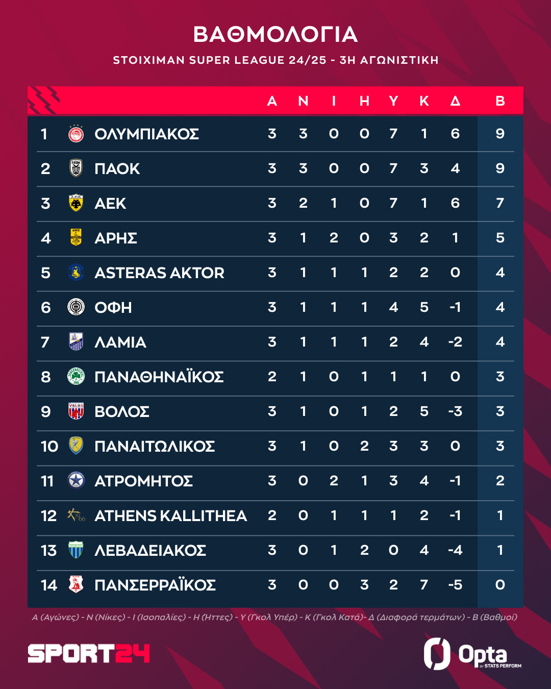 Stoiximan Super League: Η βαθμολογία μετά τη νίκη του ΠΑΟΚ στο Περιστέρι