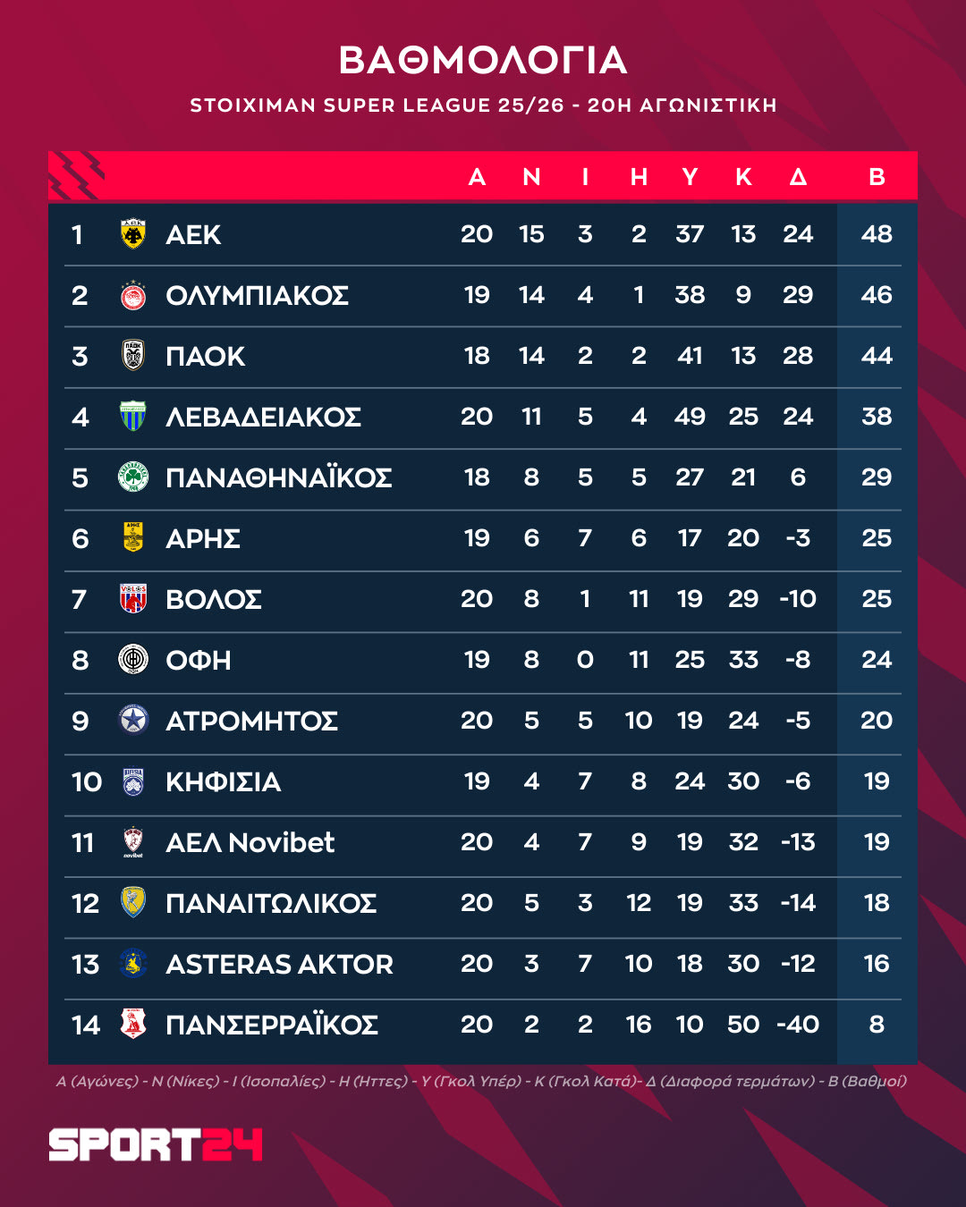 Το πρόγραμμα και τα αποτελέσματα της 20ης αγωνιστικής